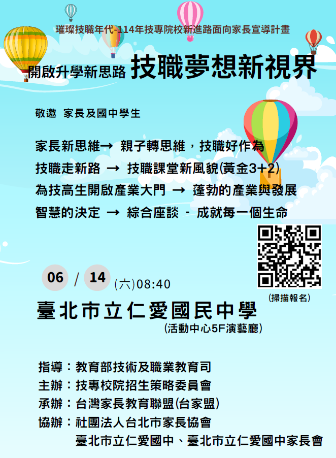 一、宣導計畫相關說明會臺北市場次訂於114年6月14日 (星期六)上午9時假臺北市立仁愛國民中學(活動中心5F 演藝廳)舉辦,參與對象為國、高中學生及家長,報名網址:請點我。