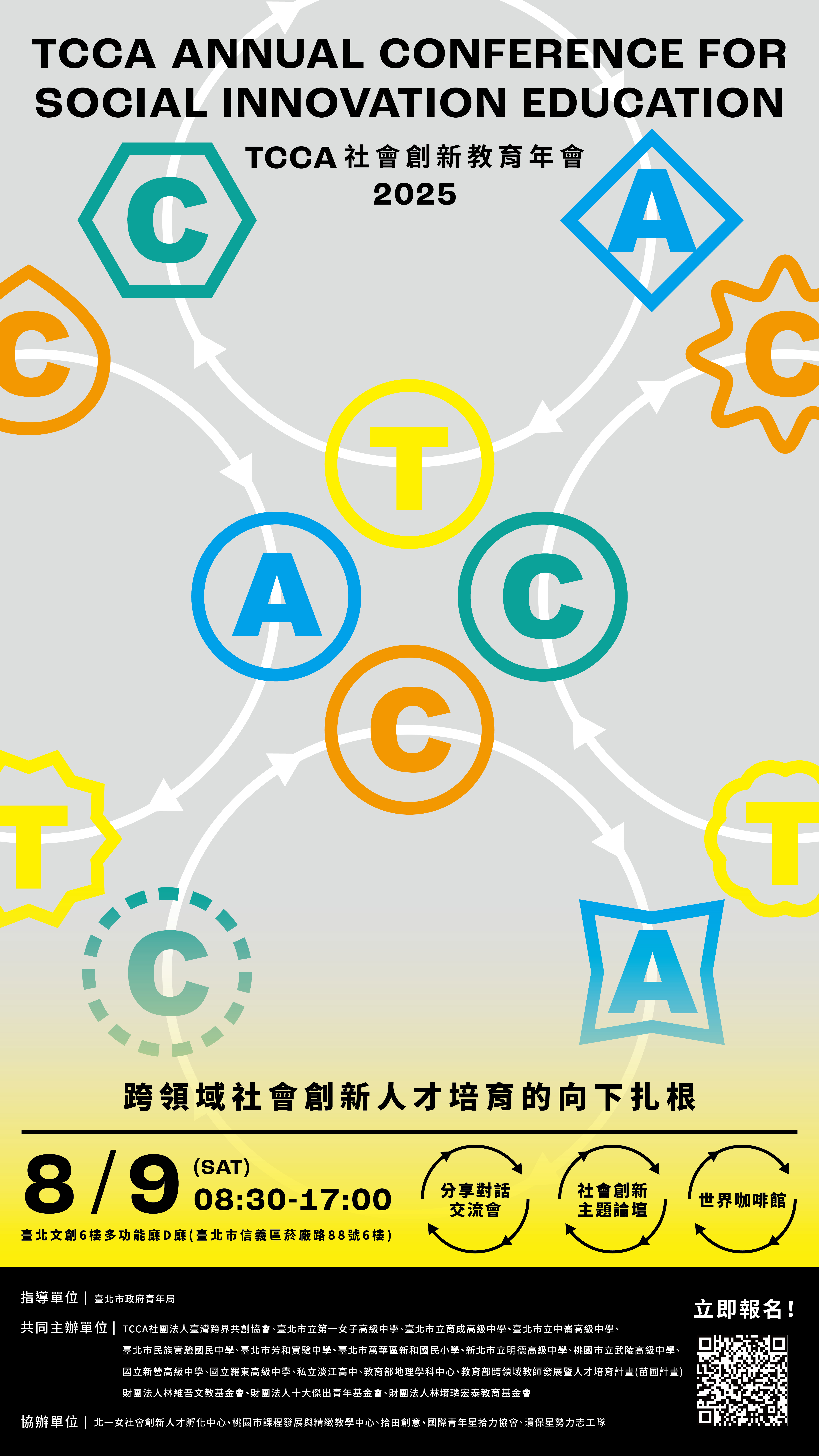 三、活動目的: (一)「以深度連結為起點,打造集體智慧共學場域」,讓每 一位參與者都能真誠分享與聆聽彼此的學習旅程、透過 深度對話、啟動願景、發現未來共創的可能性。因為 TCCA相信,每一次真誠的連結,都能開啟改變的契機。 (二)具體實現優質教育(SDG4)與建立多元夥伴關係,協力促 進永續願景(SDG17)的永續發展目標,並運用引導技術 (Facilitation)與敘畫(Scribing)促進參與者共學、共 享、共創與持續行動。(三)社會創新是讓更多人被理解的溫柔,社會創新的第一 步,就是相信你我都值得更好的未來。而你所相信的, 就是你正在創造的未來。