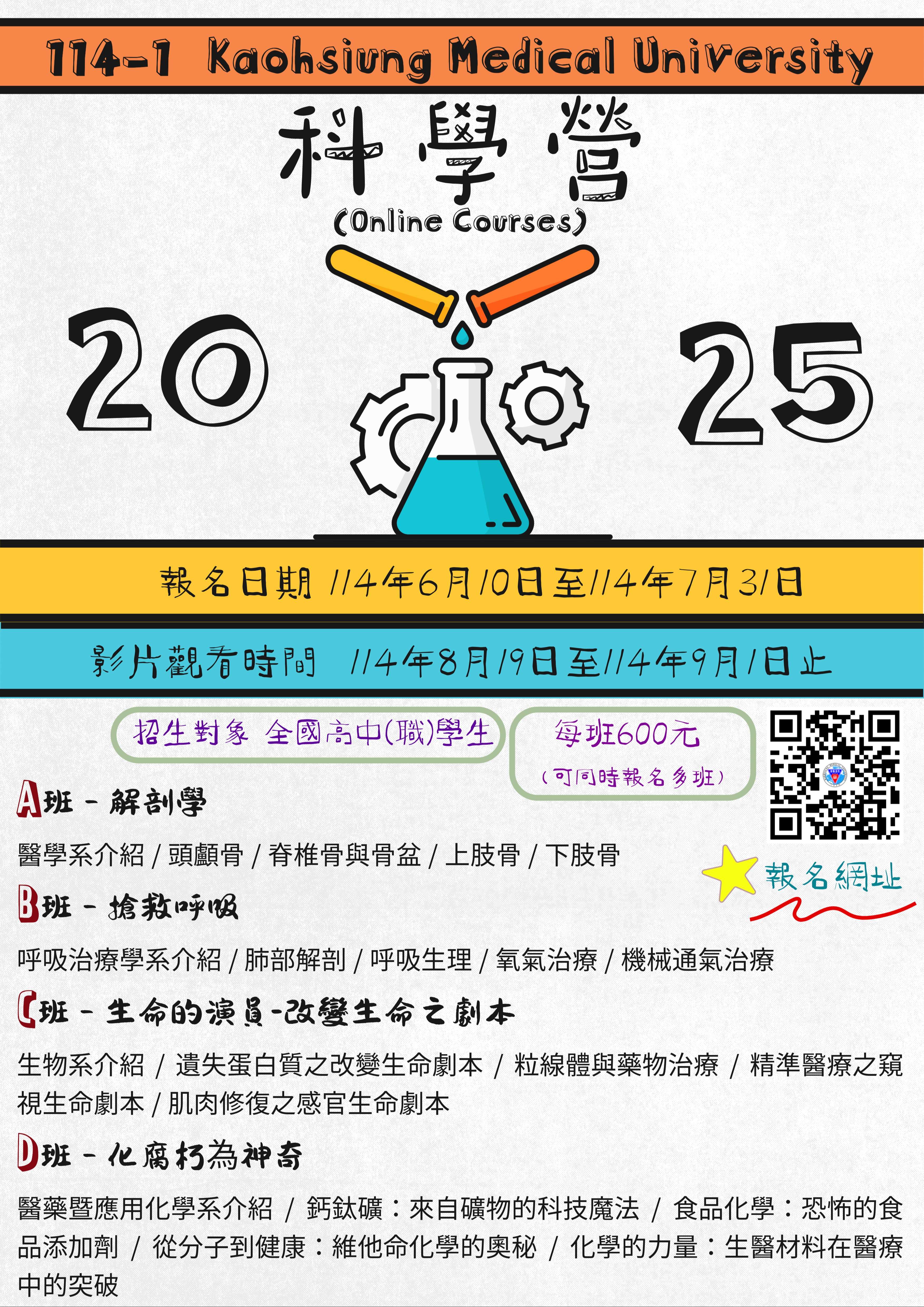 說明:本校教務處訂於114年8月19日(星期二)起辦理「114-1高 醫科學營」線上課程,旨在協助高中職學生認識醫學相關 知識及本校特色,敬請貴校協助公告並轉知所屬學生踴躍 報名參加。