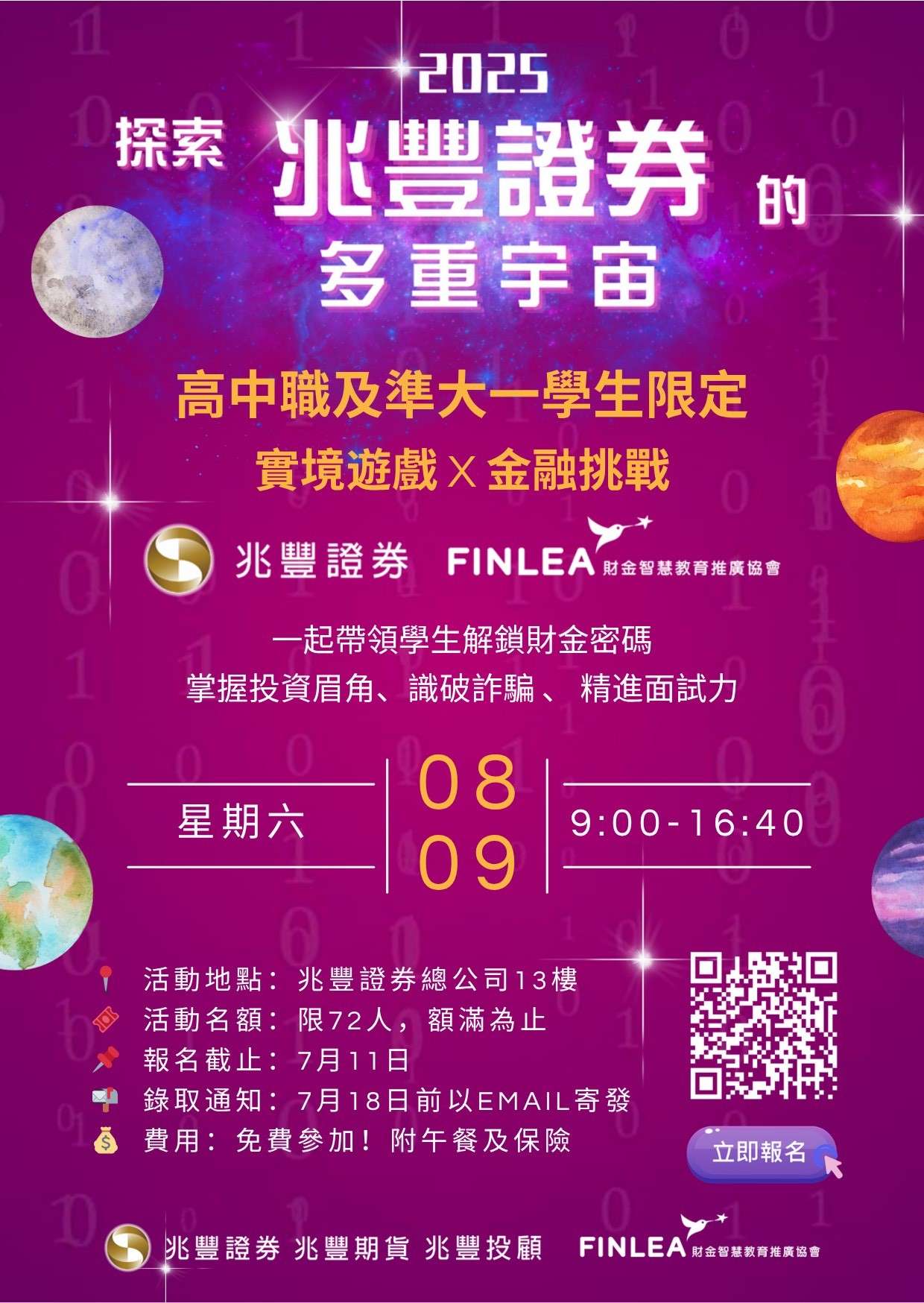 三、本次營隊為免費公益性質,限額72名,對象為年滿15歲以上之高中職學生及應屆升大一新生。課程內容包含證券實務講 座、金融防詐教育、面談應對技巧及金融實境解謎等遊戲化教 學活動,協助學生透過體驗式學習建立正確理財觀與風險意 識。