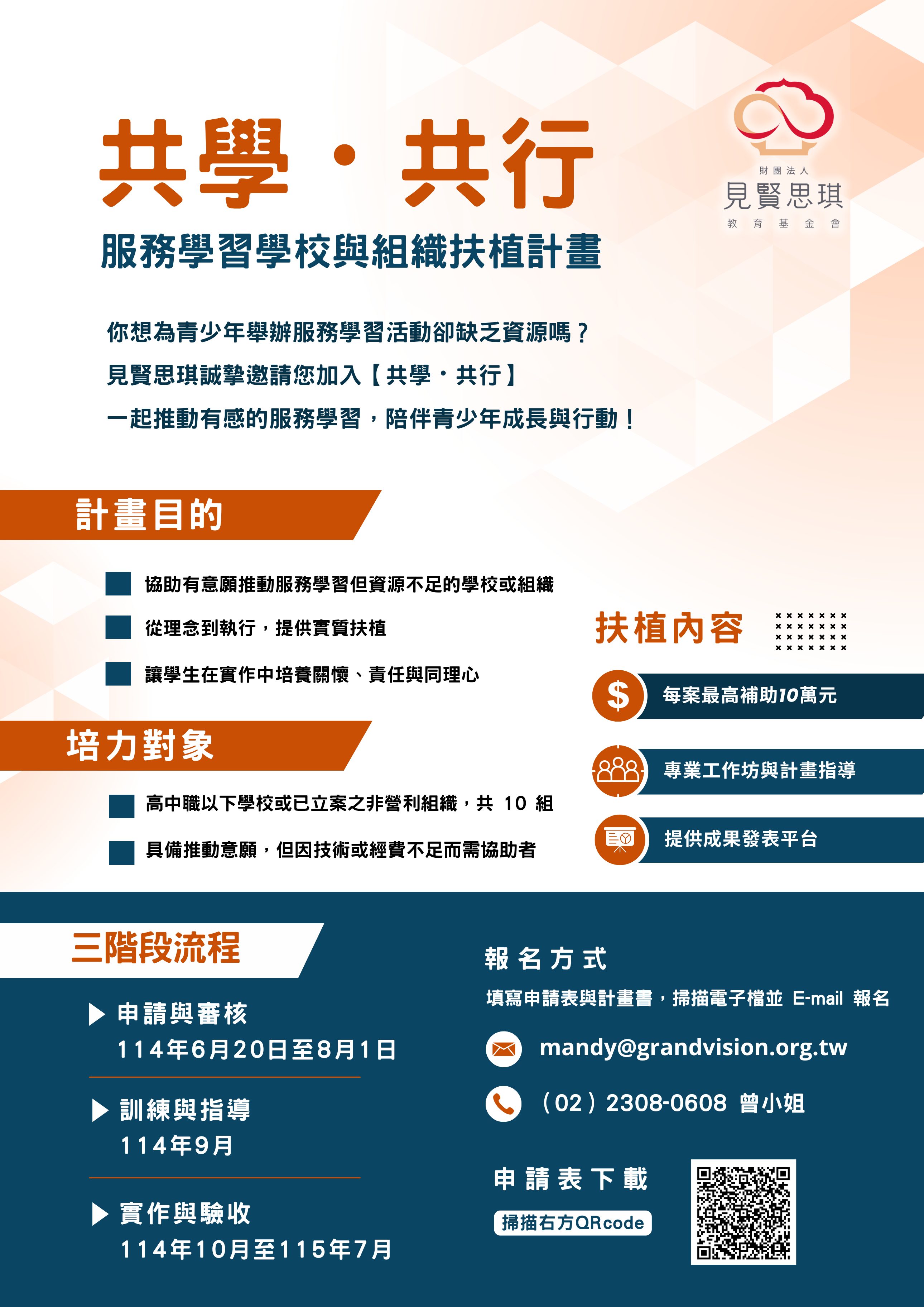 五、報名方式:請填寫申請表(如附件)及計畫書,掃描電子檔 E-mail 至 mandy@grandvision.org.tw。