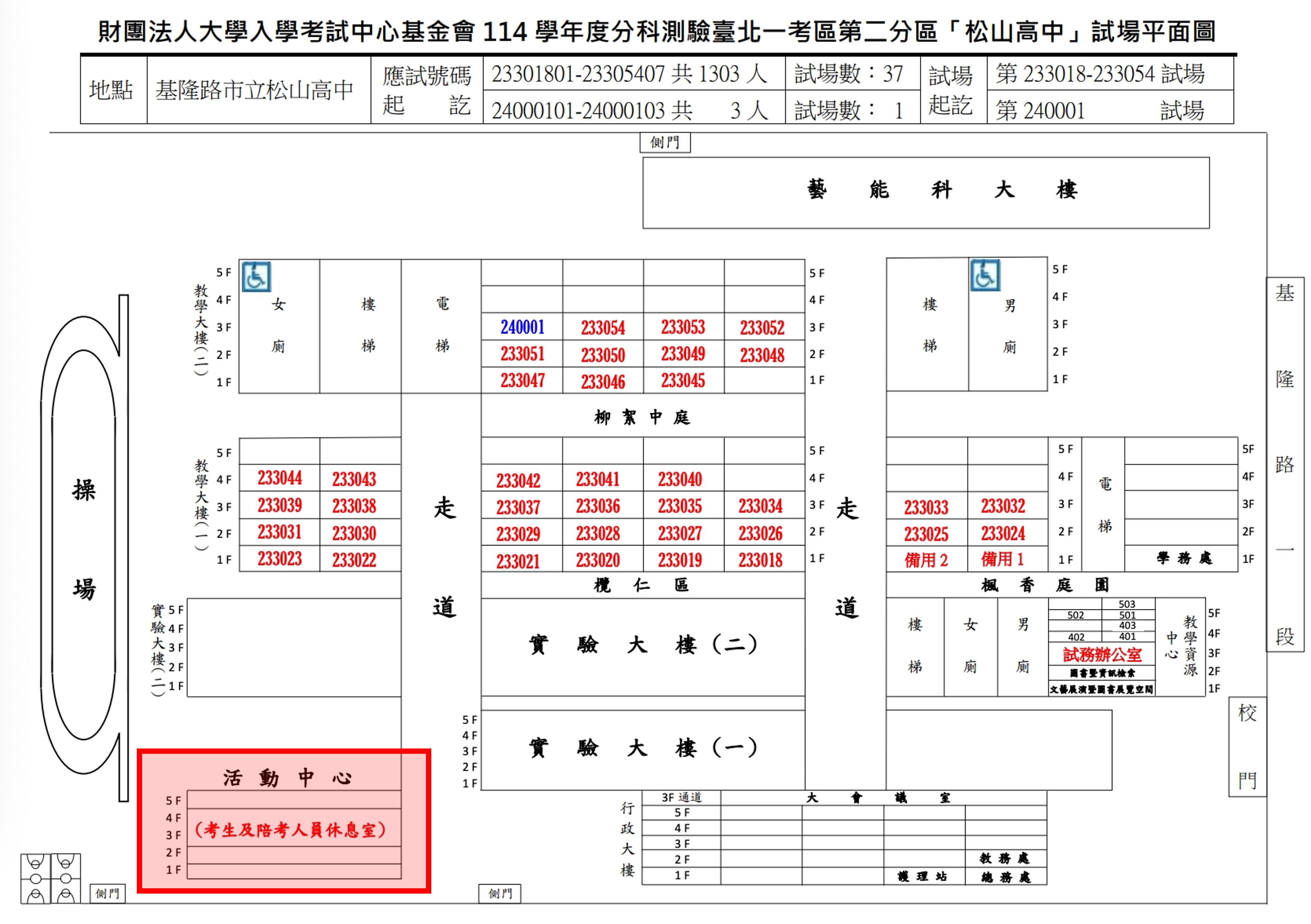臺北市立松山高級中學考生服務隊設立於:活動中心3.4樓-考生家長休息區內 (如圖)