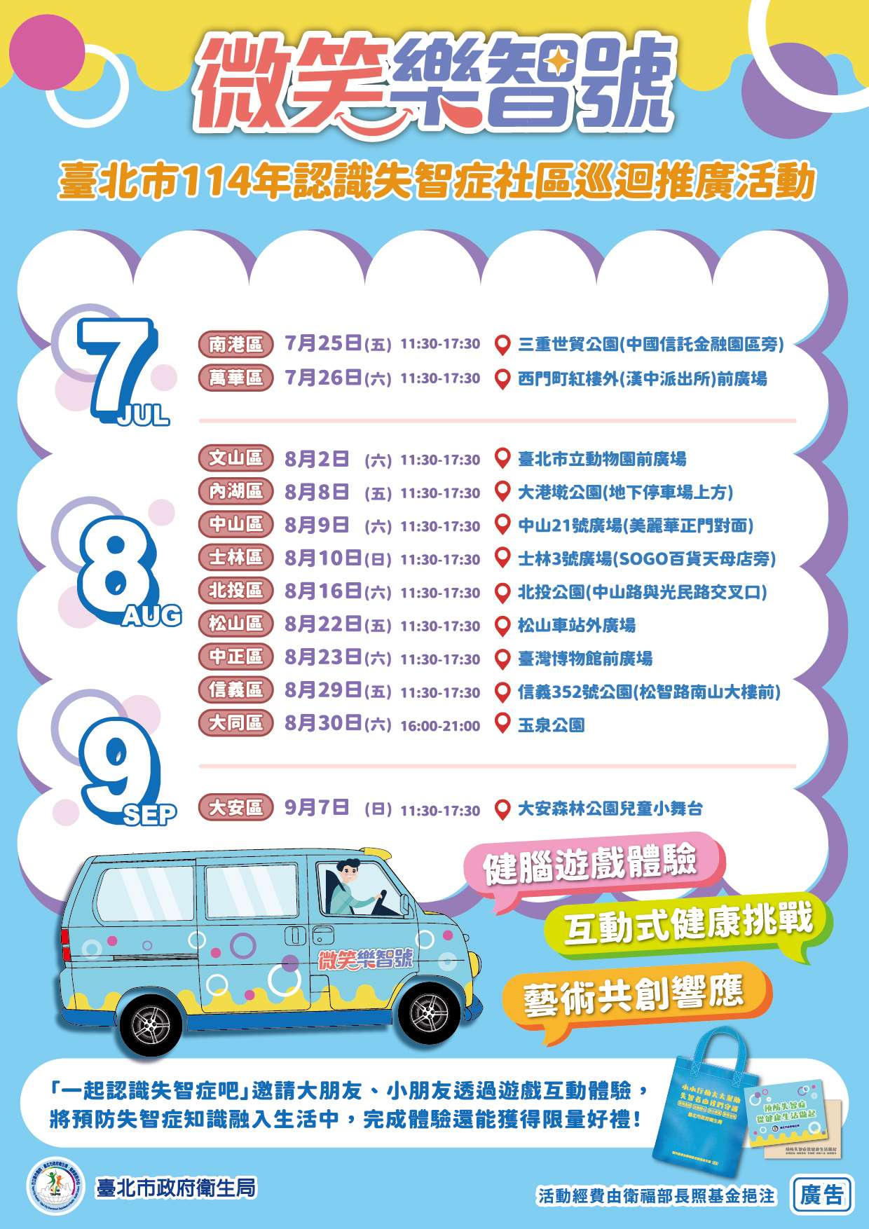 為增加民眾對失智症的認識及預防,衛生局114年7月25日至9月7日辦理12場「微笑樂智號」胖卡車認識失智症社區巡迴推廣活動,規劃「健腦遊戲體驗」、「互動式健康挑戰」、「藝術共創響應」等多元內容,巡迴本市十二行政區,藉由趣味互動吸引民眾參與,將失智症知識融入生活。請全校師生及家人踴躍參加。