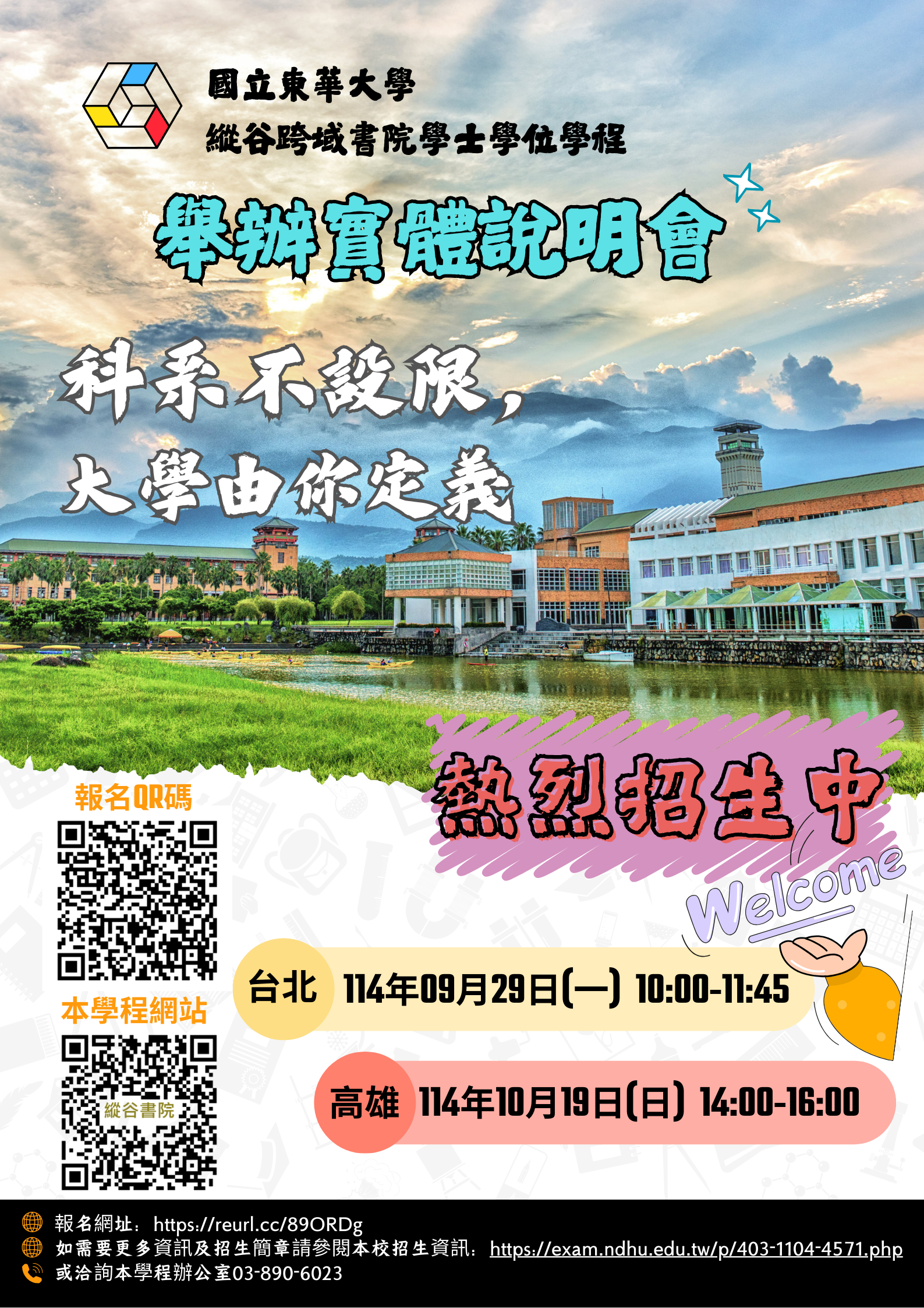 一、在這個快速變動的時代,「跨領域」有如回應社會需求的 一把鑰匙,縱谷跨域書院學士學位學程,希望透過「專題 發展專業」的育才模式,引領學子開發自我潛能與生命價 值,成為「自覺」、「自主」、「自信」的跨領域人才。 115學年度招生說明會開跑,報名相關資訊如下: