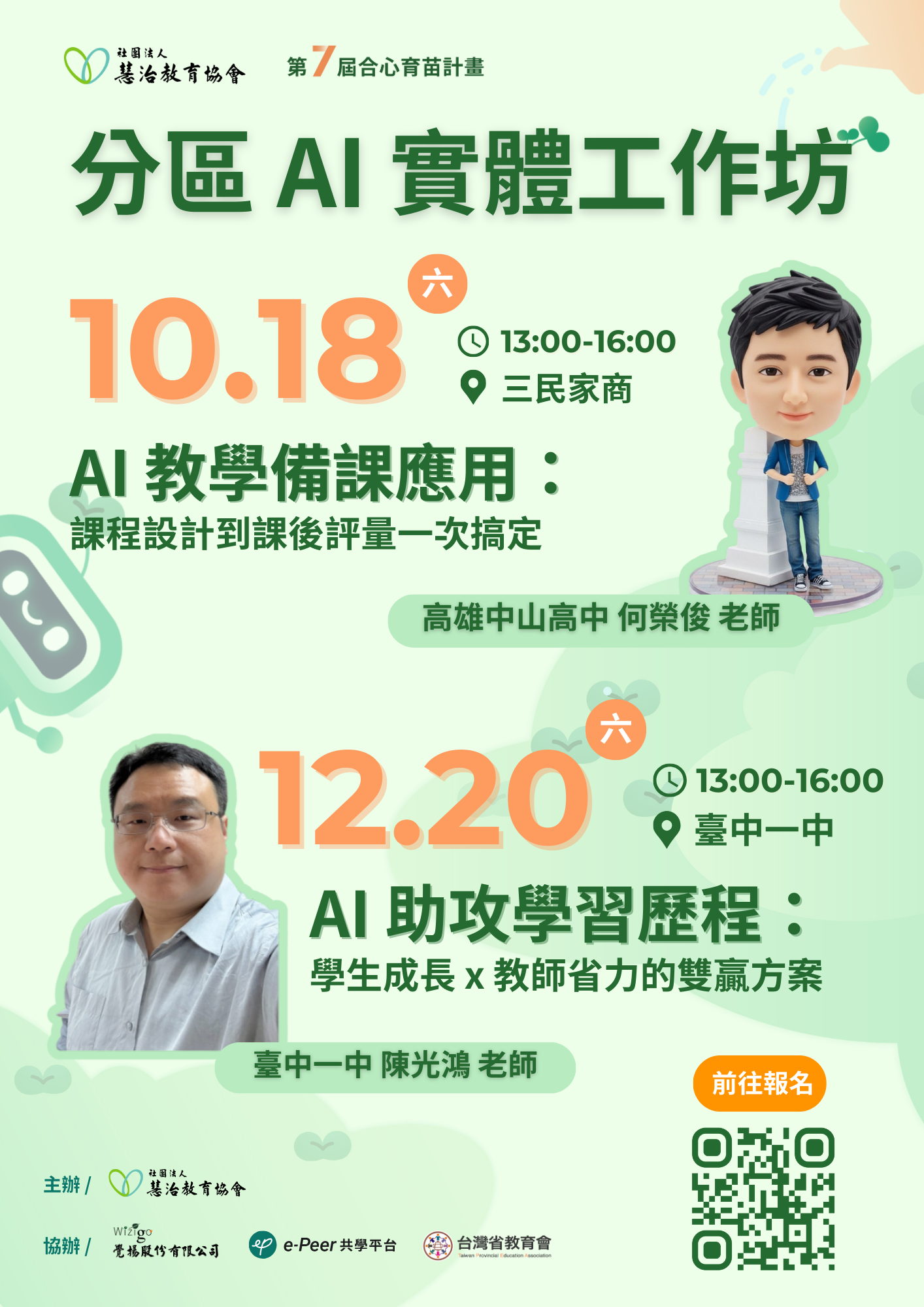 (二)中區場次: 1、時間:114年12月20日(星期六)下午1時至下午4時 2、主題:AI助攻學習歷程:學生成長 × 教師省力的雙 贏方案 3、地點:臺中市立臺中第一高級中等學校 4、講師:臺中第一高級中等學校陳光鴻老師