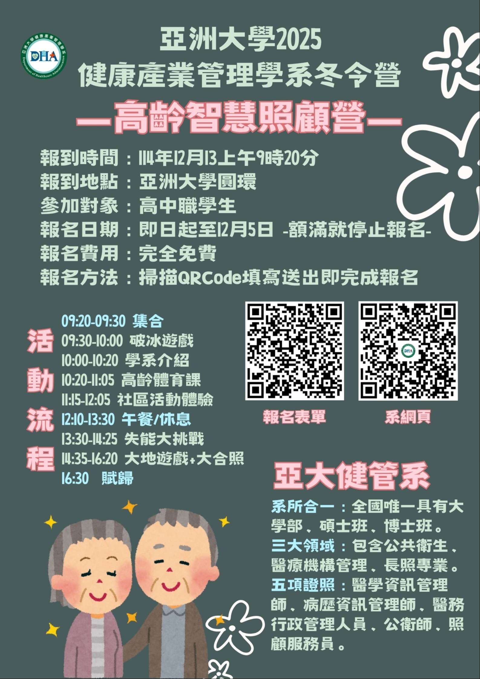 四、相關活動訊息及報名方式請參閱營隊海報,報名網址如 下: (一)高齡智慧照顧營:請點此 。 (二)醫療機構管理營:請點此 。