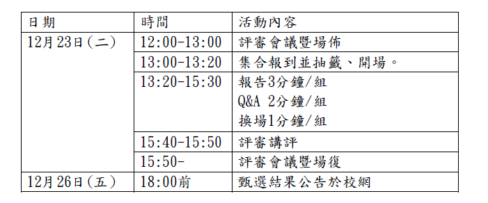 五、114 年 12 月 18 日 ( 四 ) 18:00 前於學校官網公布校內發表會名單,請同學自行於學校官網或向設備組確認競賽名單,參賽選手由設備組統一請公假。