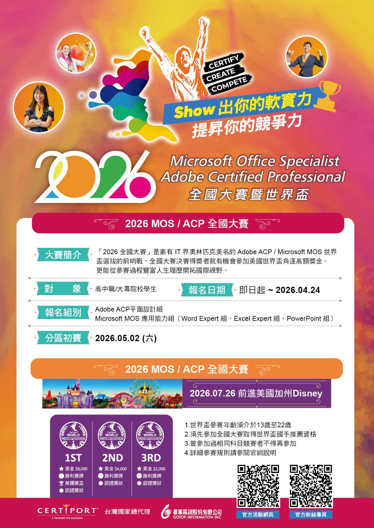 三、「2026 Microsoft MOS / Adobe ACP World Championship世界盃競賽」係由全球最知名科技巨擘Microsoft、Adobe與IT專業認證服務商Pearson VUE/Certiport主辦,去年共有來自108個國家,超過200,000名選手參與本國際賽事,角逐世界冠軍寶座。
