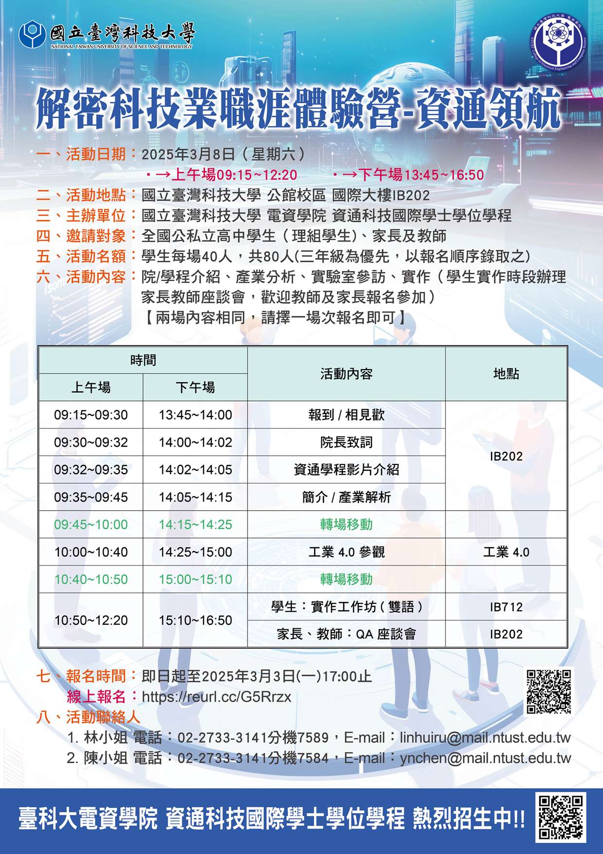 三、隨函檢附「資通科技國際學士學位學程」簡介資料、「解密科技業職涯體驗營_資通領航」活動資訊,鼓勵同學參加。