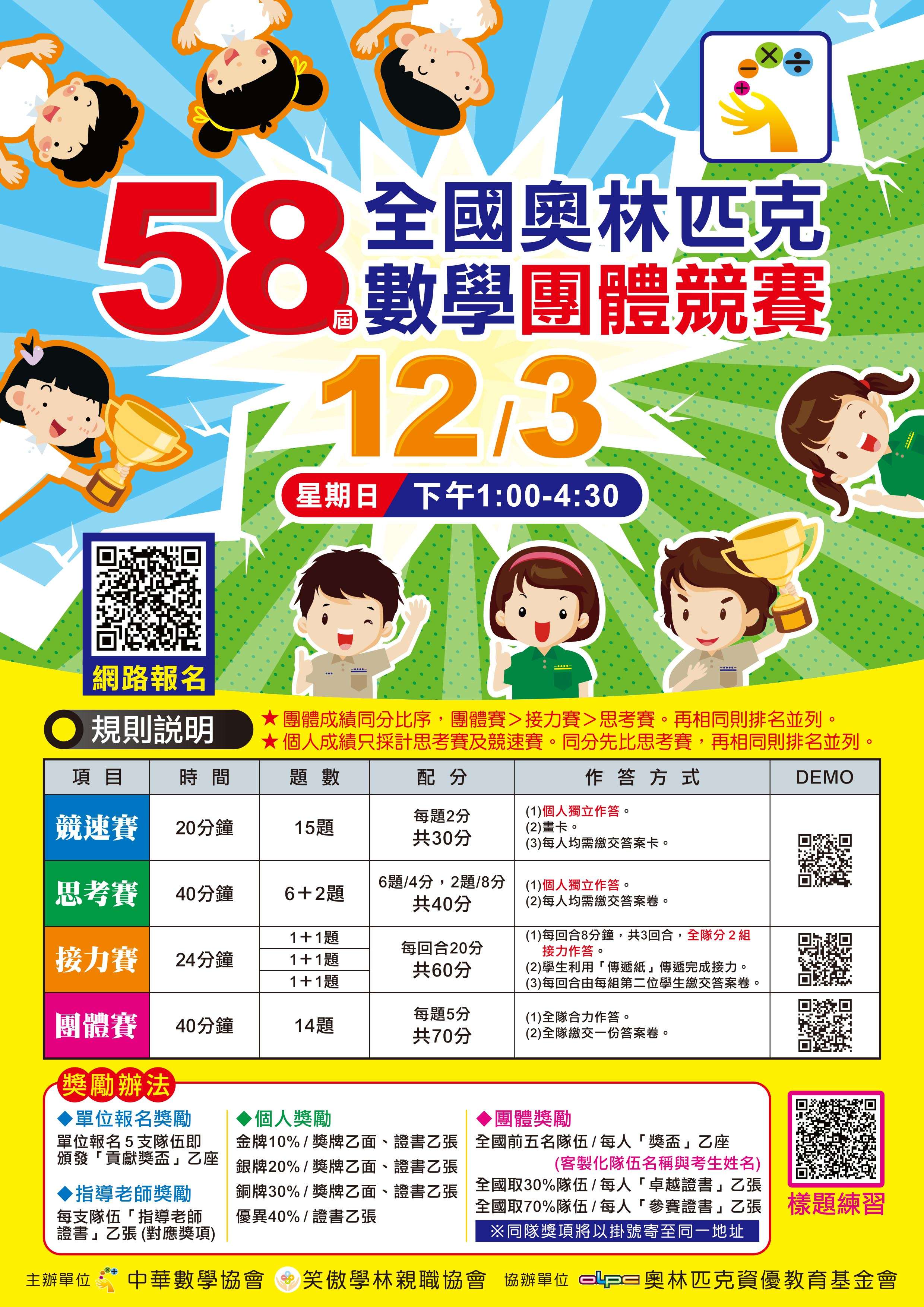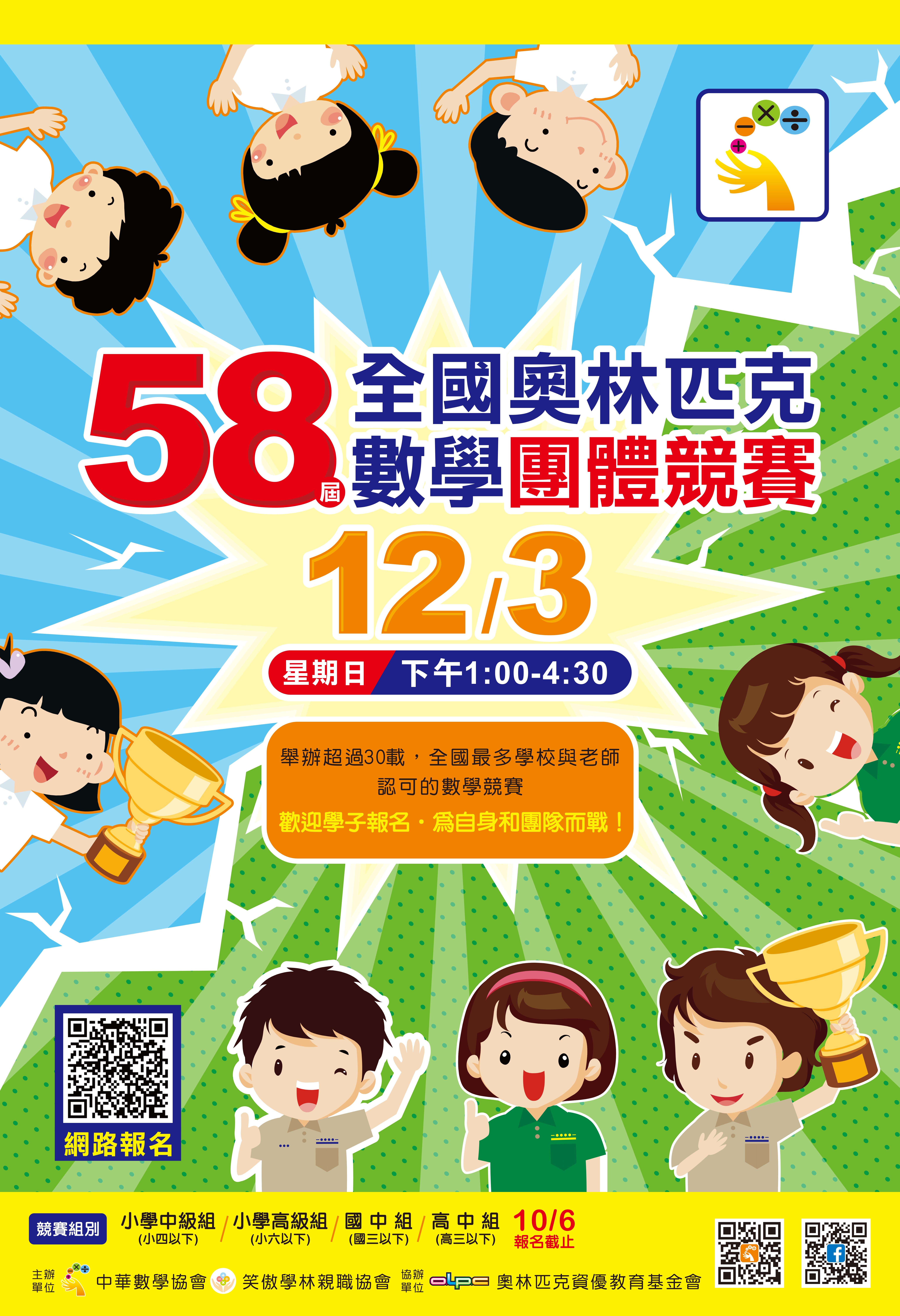 主旨:本會為推廣國小、國中至高中之數學教育,謹訂於112年12月3日(日)舉辦 「第58屆全國奧林匹克數學團體競賽」,旨在培養學童對數學的興趣,為國家培育優秀人才。建請 貴校公告並推薦學生參加競賽,以提升數學教育,歡迎共襄盛舉。請 鑒核。