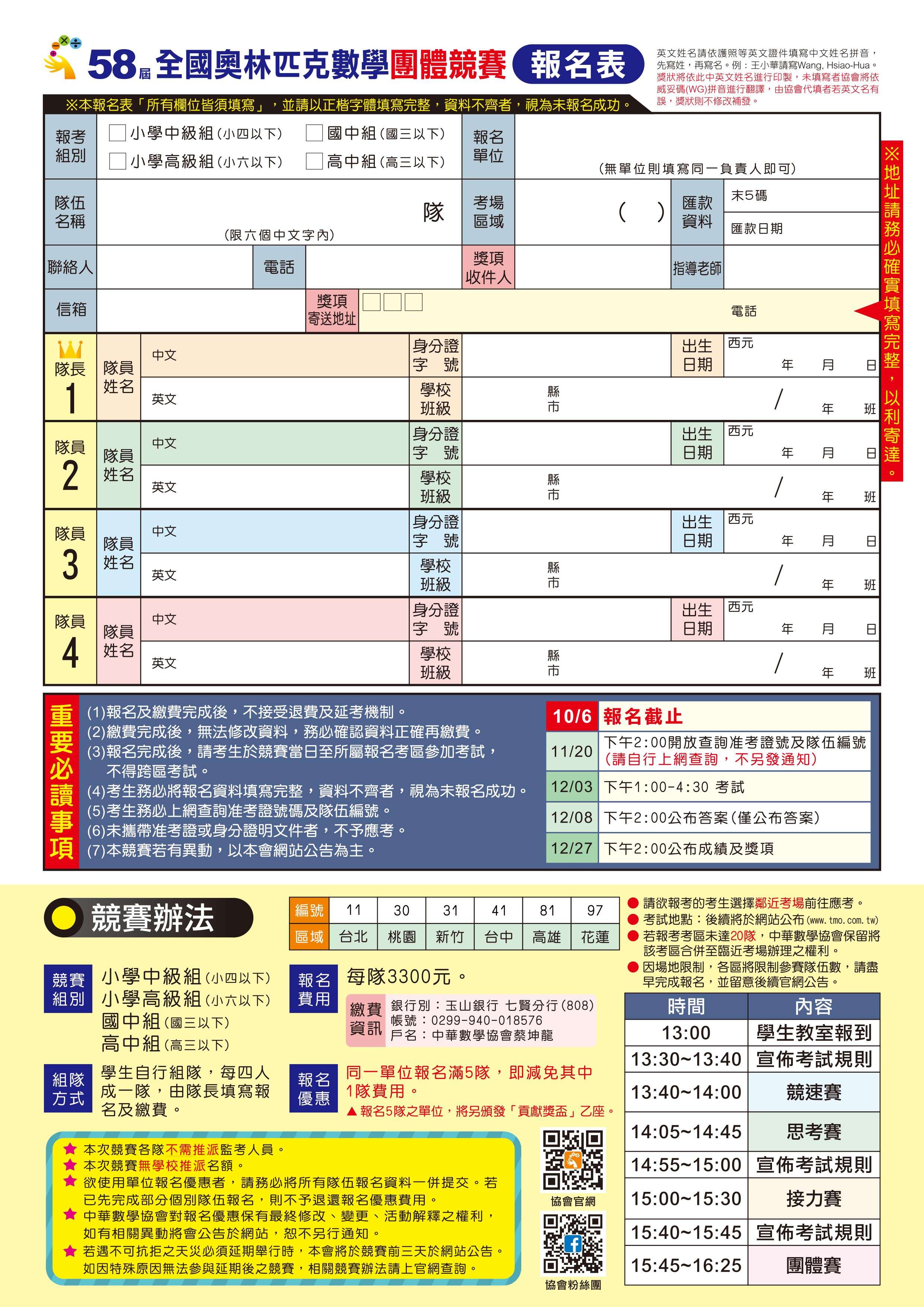 二、檢附「第58屆全國奧林匹克數學團體競賽」競賽活動簡章,供 貴校參閱。