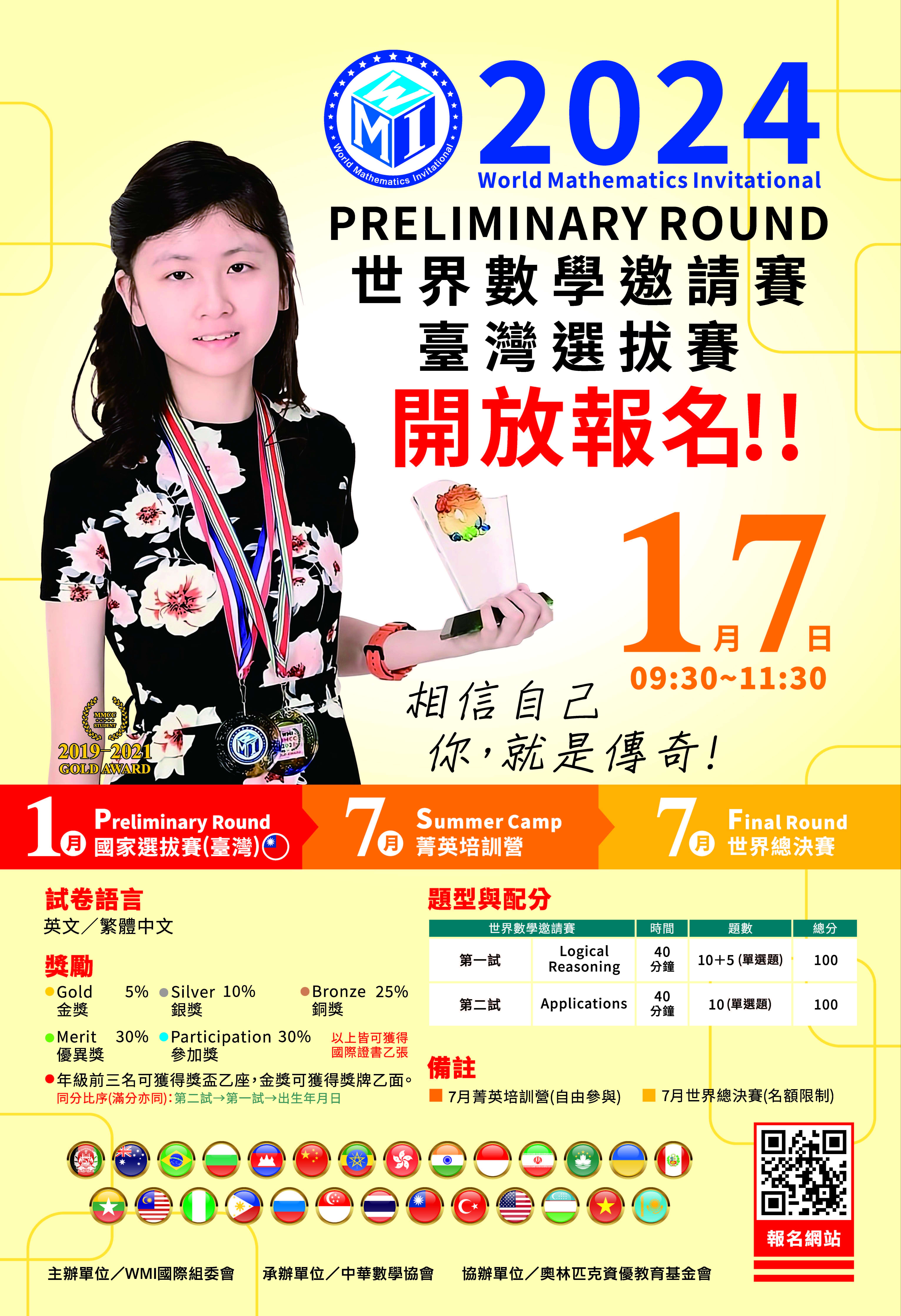 三、「WMI世界數學邀請賽-2024臺灣選拔賽」,凡就讀臺灣各縣市之公私立幼兒園至高中三年級之我國籍在學學生,均可報名參加,歡迎愛好數學的學生們踴躍報名,一同響應,為台灣爭取榮耀。